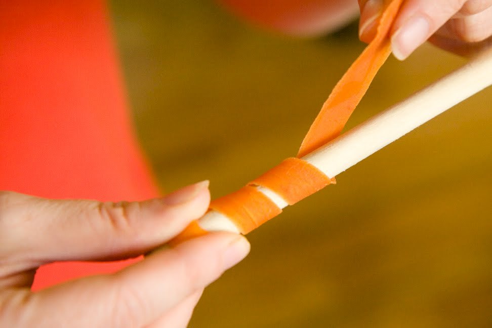- Working quickly, wind carrot strips, one at a time, in a loose spiral around a chopstick. Place the chopstick with the carrot still wrapped around it back on the baking sheet, seam side down.