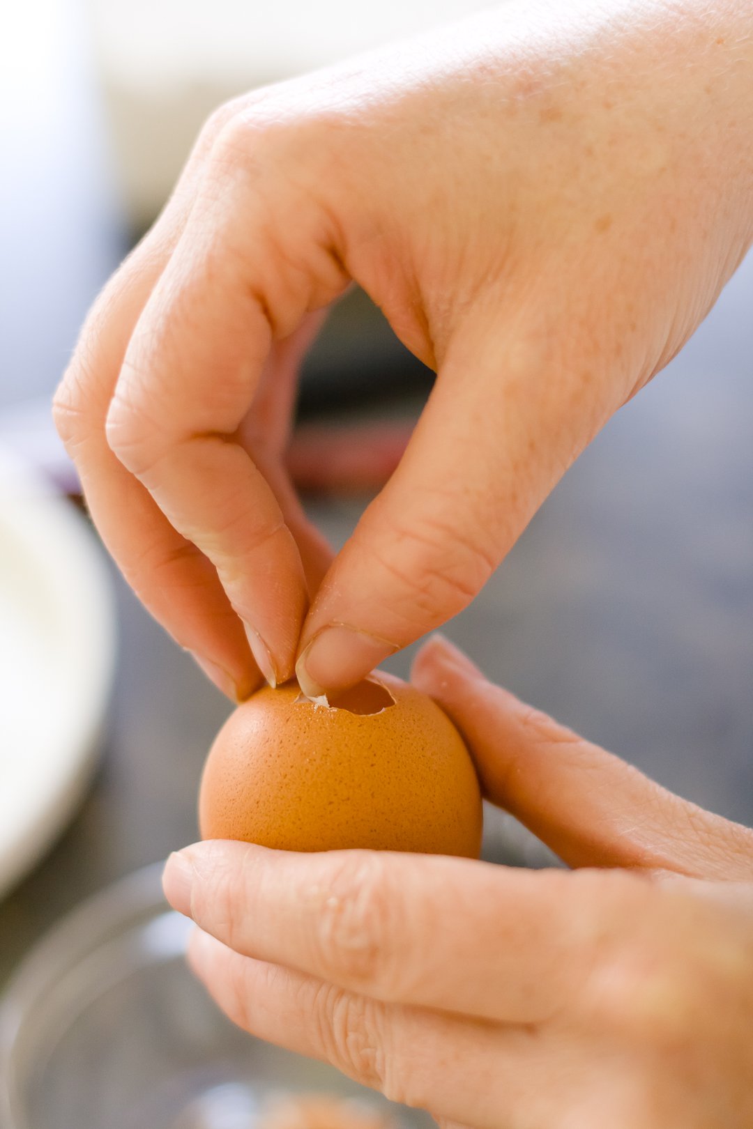 Once you have poked tiny holes in your eggs, peel back the edges of the hole to expand it a bit. The holes need to be large enough to fit the tip of a piping bag inside. You can always make the holes larger when you are ready to pipe so err on the smaller side during this step.
