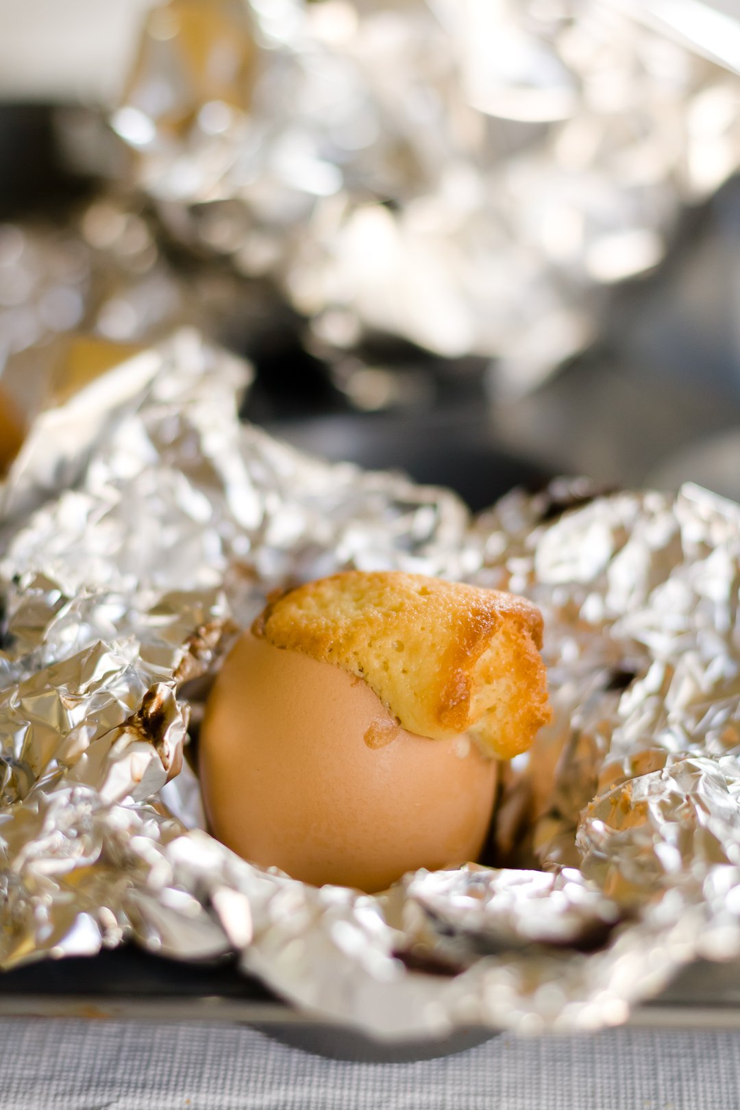 I found that it was best to let the cake overflow out of the top of the egg and then simply pick it off (eat it) and clean the shell with a damp towel before serving.