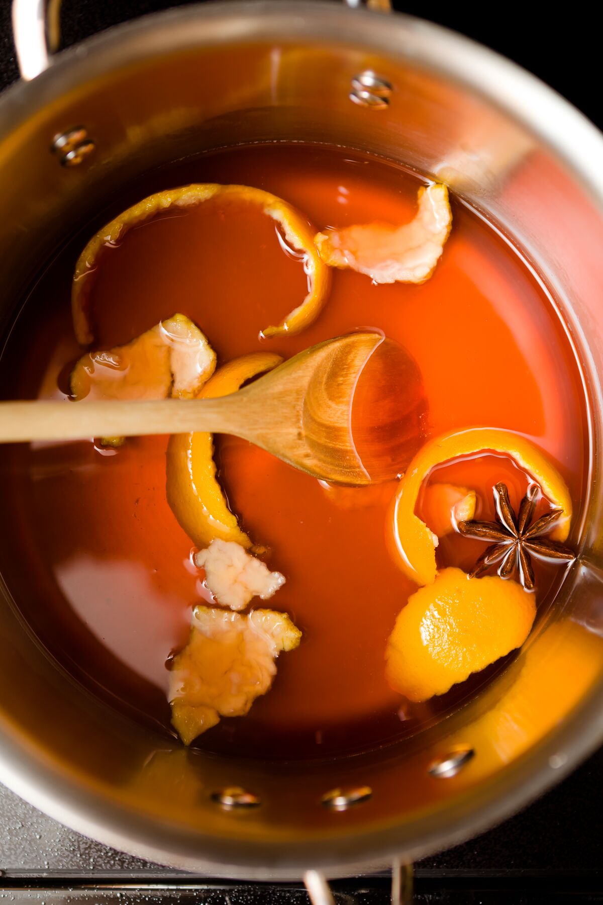 Add water, pomegranate juice, sugar, lemon juice, salt, star anise, and orange peel to a pot over medium-high heat.