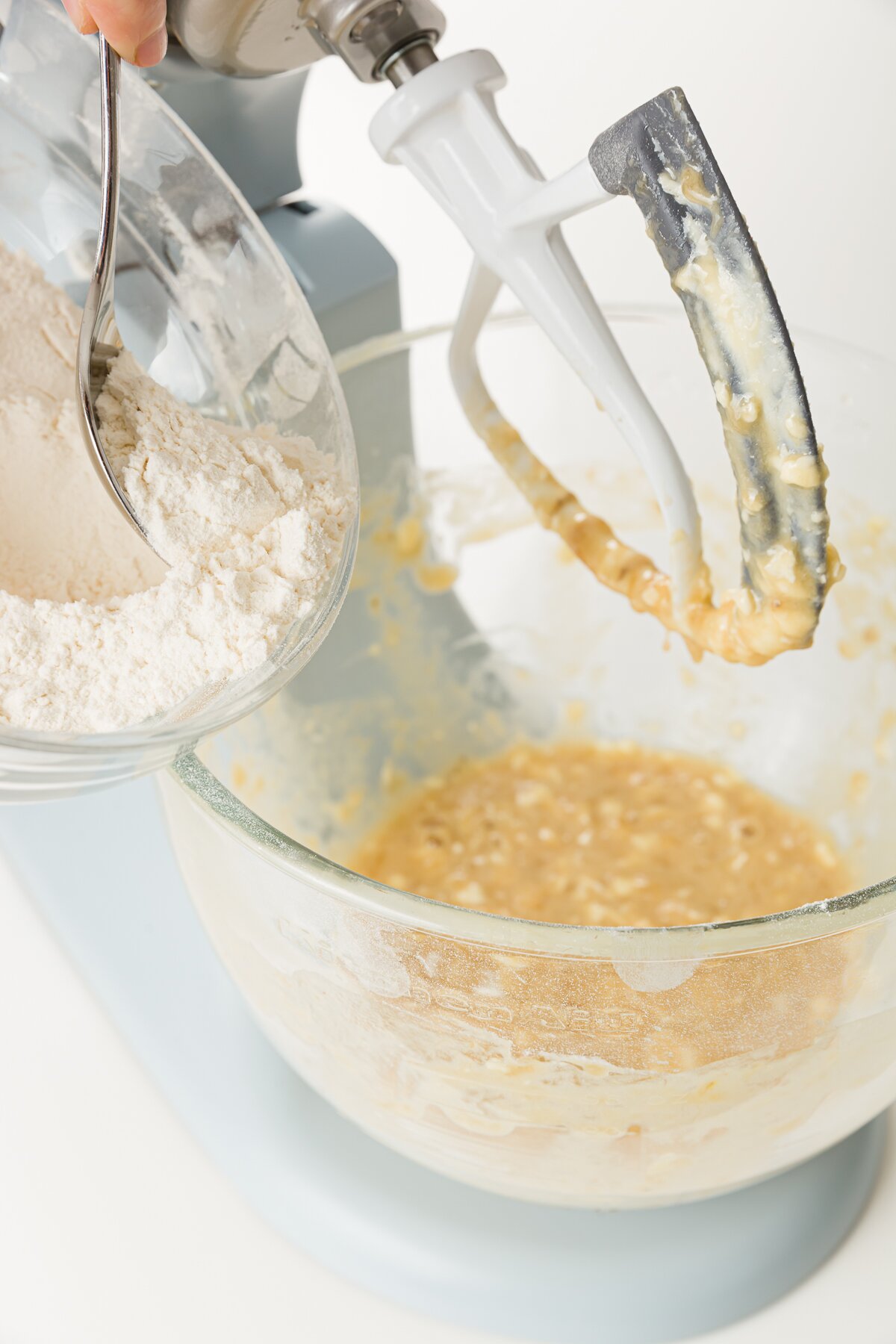 Next, mix softened butter, white and brown sugar, vanilla, and mashed bananas. Don’t worry if you still see small bits of butter in the batter after mixing; that is normal. They will melt into the cookies when you bake them.