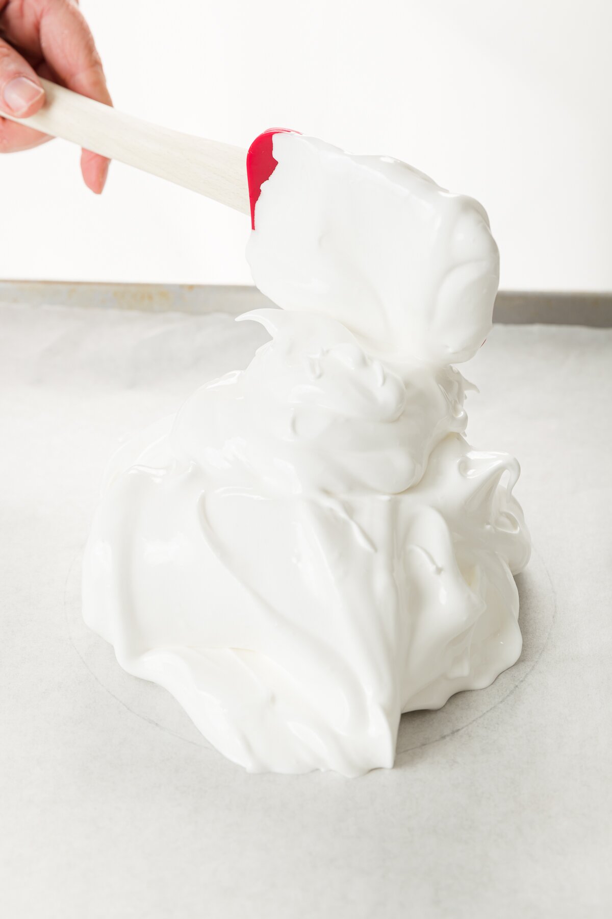Shape it by using an offset spatula [paid link] to lift the meringue up from the base to the top. Repeat this process around the entire circumference of the fluffy mixture. Leave (or create) a slightly indented area at the top for whipped cream and berries.