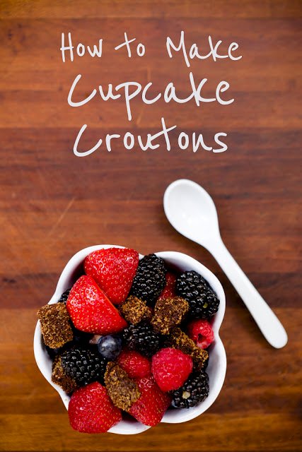 Turn any flavor cake or cupcakes into croutons by dehydrating it in the oven or a dehydrator. Serve the croutons as part of dessert fruit salad!