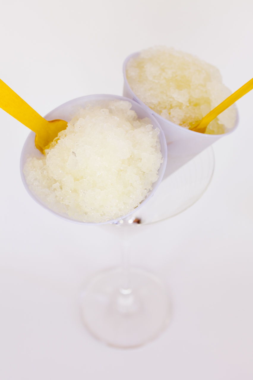 - Divide shaved ice into 4 cups and drizzle limoncello syrup on top.