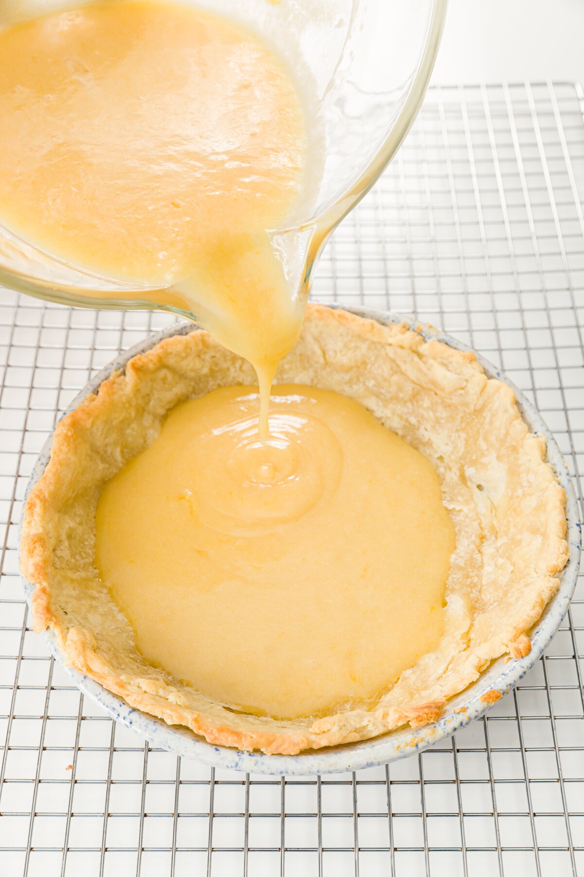 Pour the filling into the pie crust and bake! You’ll want to check the crust periodically to make sure it isn’t burning. If it is, cover it with foil or a pie guard [paid link].