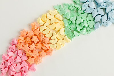 | I opted for the original Lucky Charms shapes: pink hearts, orange stars, yellow moons, green clovers, and blue diamonds (the first added shape). The shapes now are somewhat different. |