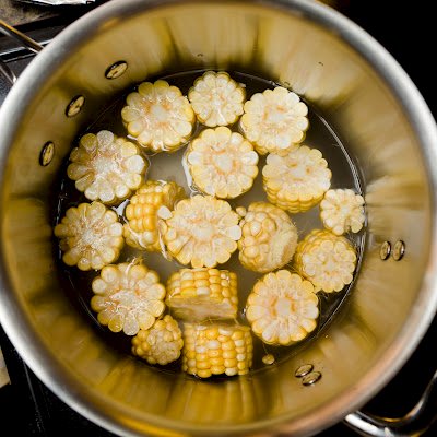 - Bring a medium-sized saucepan filled with the water and cut corn to a boil.