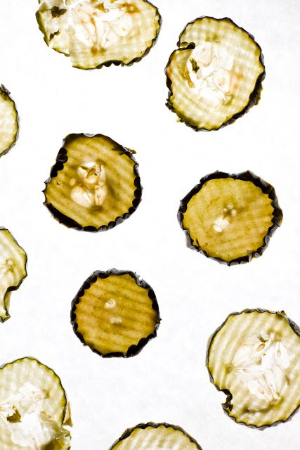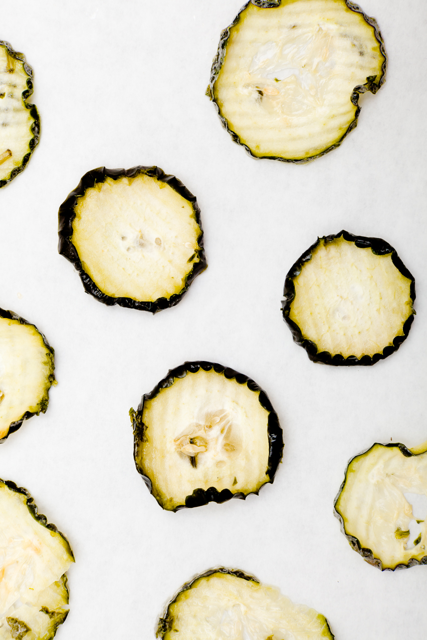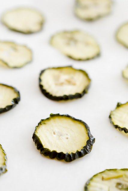 - Thinly slice the cucumber. I found that 1/4" slices worked the best. I tried using 1/8" slices and many of them broke when I lifted them off of the baking sheet. I used the crinkle cut blade on my mandoline [paid link] to cut them, but you could certainly cut them by hand (and not obsess about making them all equal thickness).