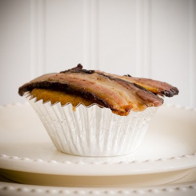 Top the cupcakes with the sweetest bacon you can find. I used Black Forest bacon. Don’t overcook it. The cupcakes don’t like bacon that’s all shriveled up.