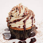 Pipe frosting onto cooled cupcakes. Optionally drizzle with chocolate syrup and top with chocolate shavings.
