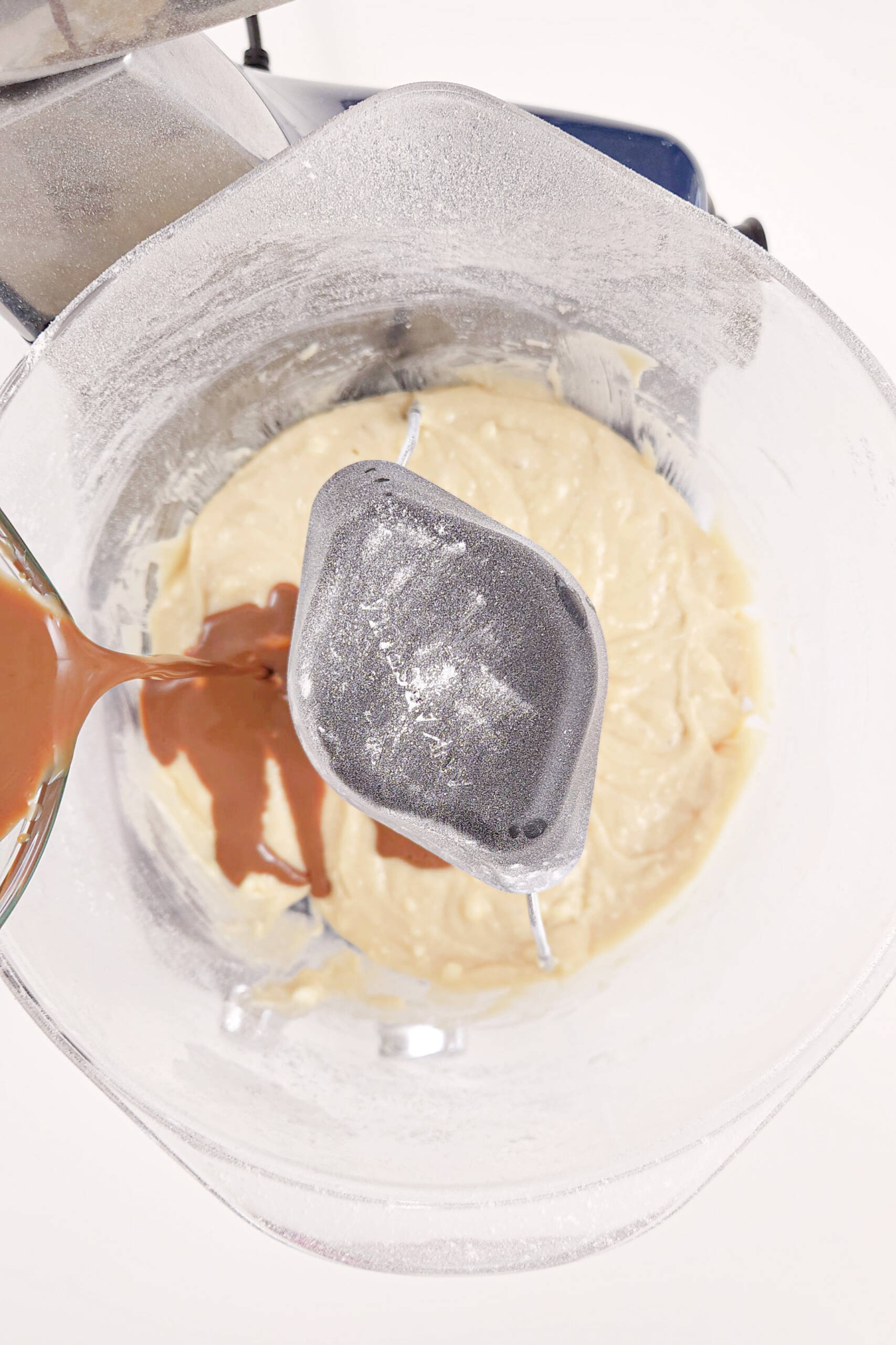 - Add coffee mixture to the batter and mix on low. The batter will be liquidy.