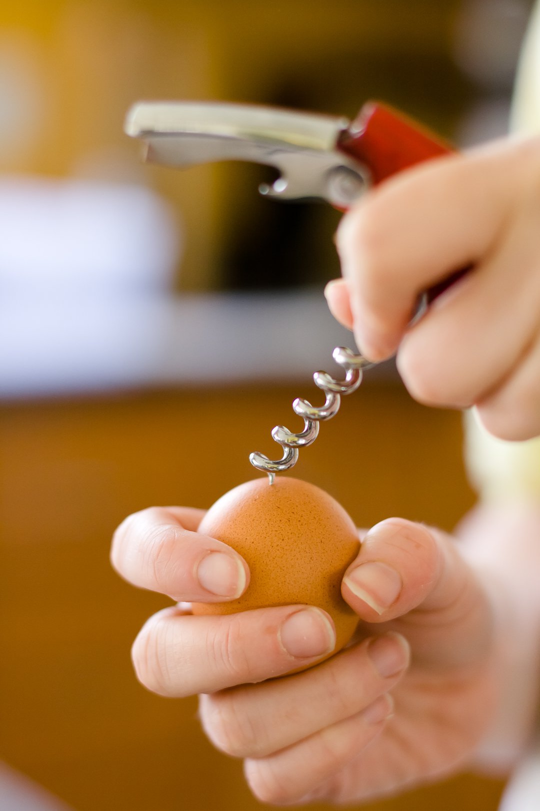- Carefully poke a small hole in the top of each egg. I found that the easiest way to do this was to use the tip of a corkscrew bottle opener.