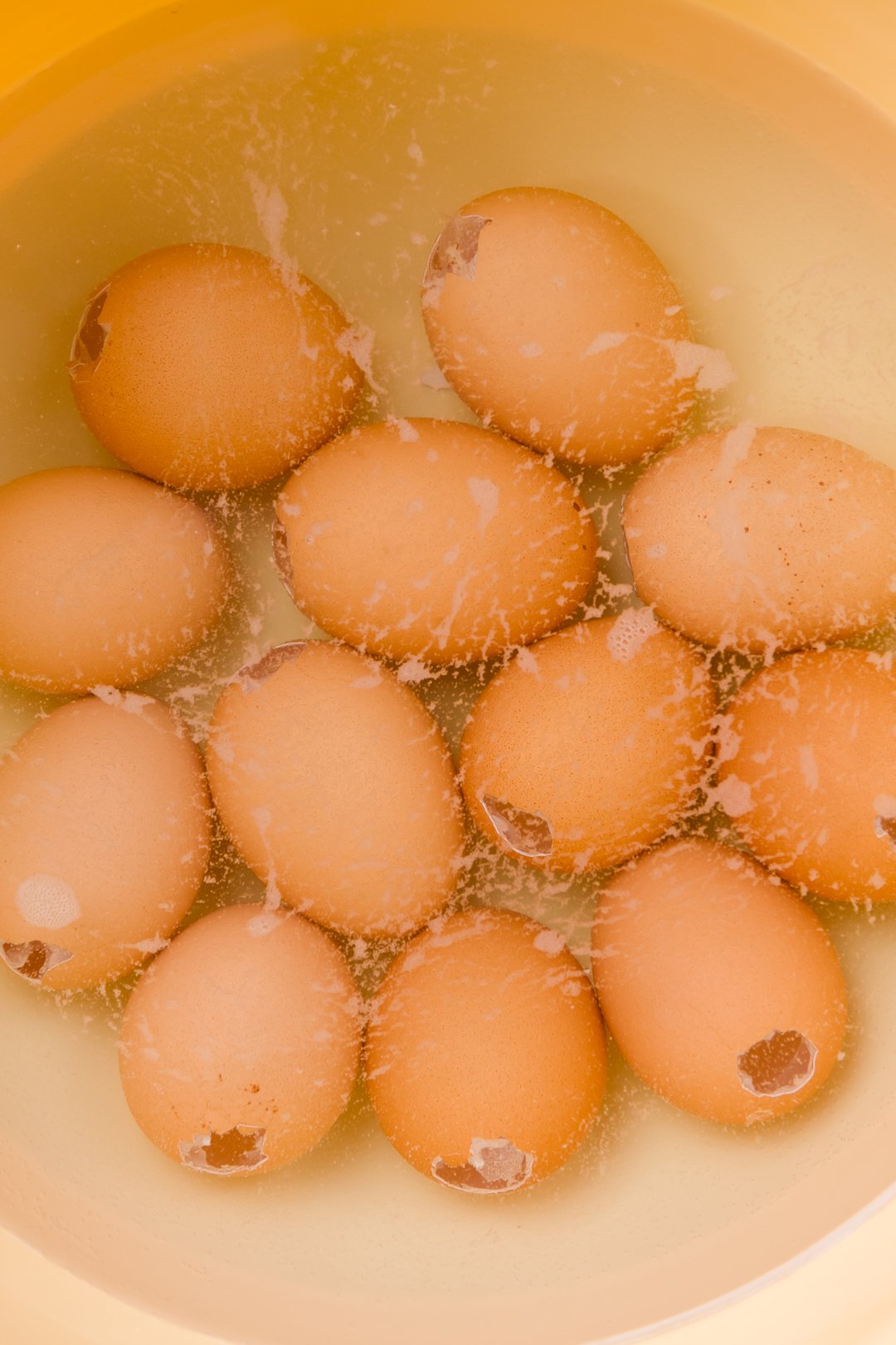 Rinse the eggshells in cold water and lay the eggs hole side down on a paper towel to drain and dry.