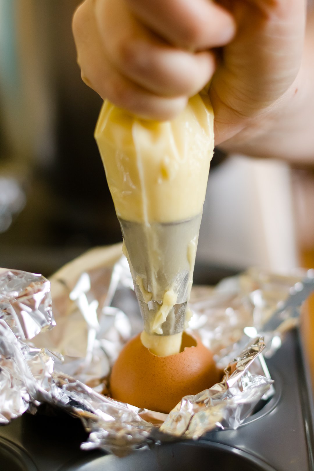 - Load the batter into a piping bag fitted with a large round tip. Make sure that the tip can fit all of the way inside of the hole in each egg. If it can't, slowly expand the hole a little bit at a time until it fits.