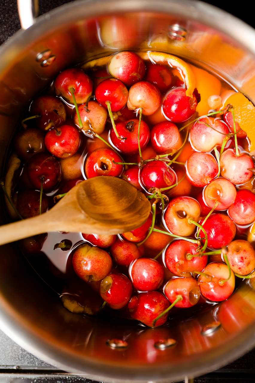 Add in the pitted cherries and let simmer for 10 minutes or until the juice has taken on some cherry flavor. (You’ll have to taste it to check.)