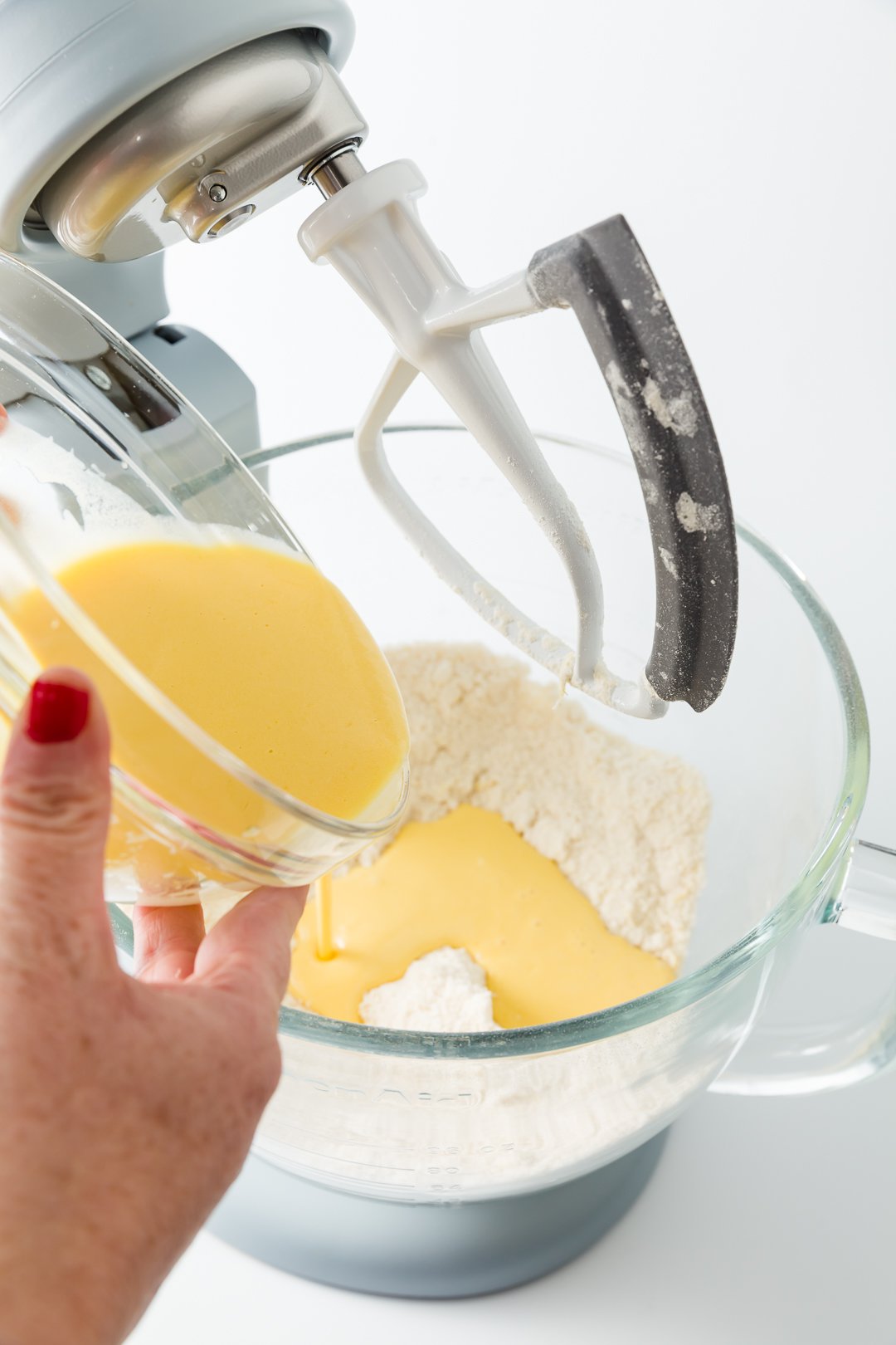 - Add the egg mixture to the flour mixture and beat on medium speed until just combined.