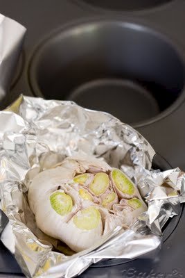 - Put each garlic head in foil and place them in a cupcake tin, as shown above.