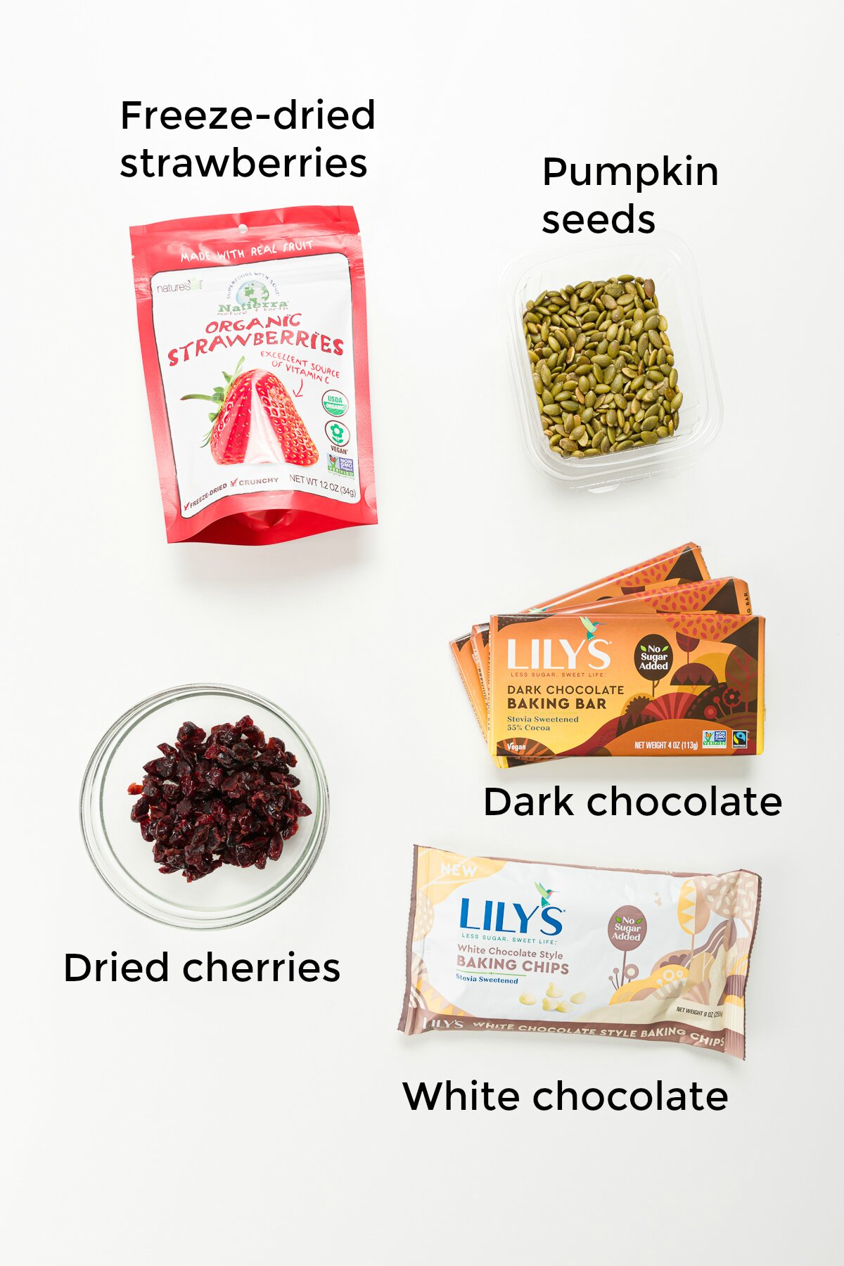 - Working quickly, top the chocolate with dried cherries, freeze-dried strawberries, and pumpkin seeds.