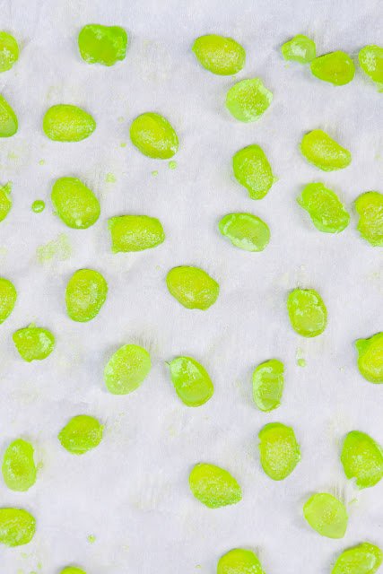 - Fish the coated beans out of the liquid and place them on fresh parchment to dry and harden overnight.