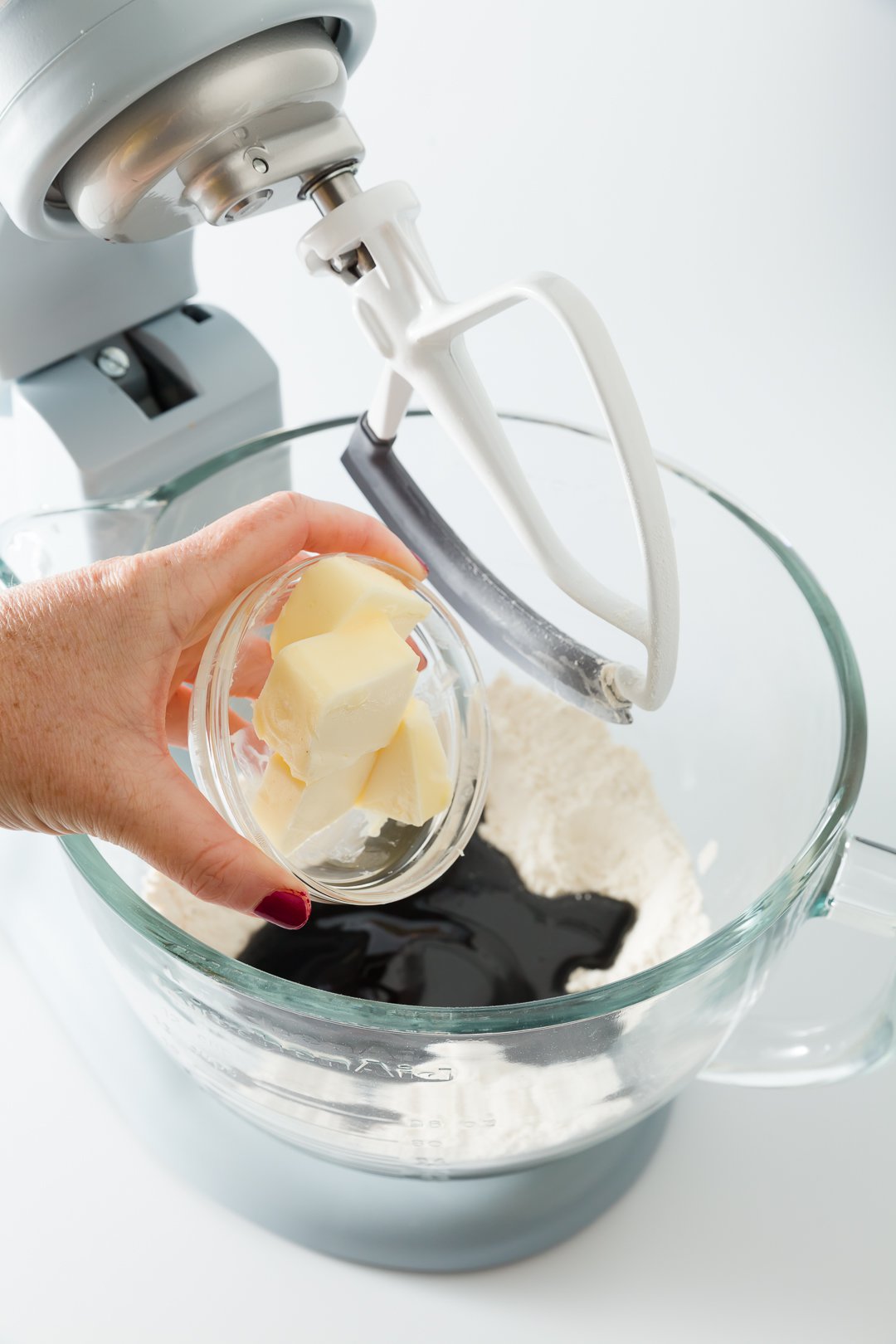 - Mix in the sugar, molasses, and butter. Be sure to mix for a few minutes to make sure that all of the ingredients are fully incorporated.