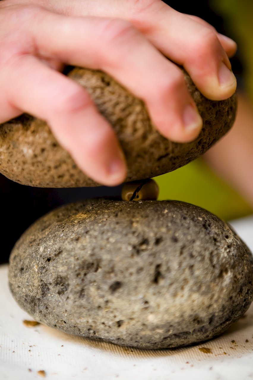 Traditionally, acorns are cracked open using rocks. Bryan has special rocks that he uses for this purpose. The rock on the bottom has a groove where you set the acorn (shown below). You then bang the top rock over the acorn to crack it. The whole experience is very satisfying in a primal way.