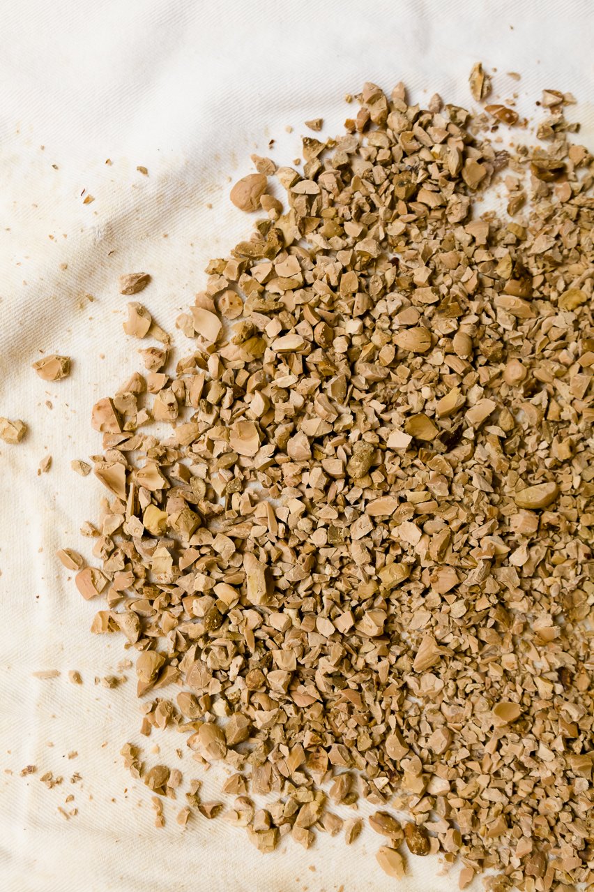 You could again use rocks to do this, but a food processor is so much easier! Since the acorns are VERY hard, to keep your food processor from working so hard and overheating, first soak the acorns in a bowl of water overnight to soften them. Then, food process the acorns until they are broken into small pieces.