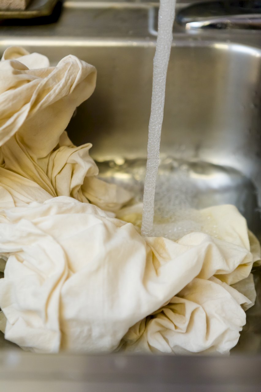 Bryan leaches his acorns in a stream. He wraps the acorns in a cotton cloth, ties the cloth to a branch, and puts it in the water. The water runs through the acorns and leaches the tannins out. If you don’t have a clean stream nearby, I recommend the sink method: