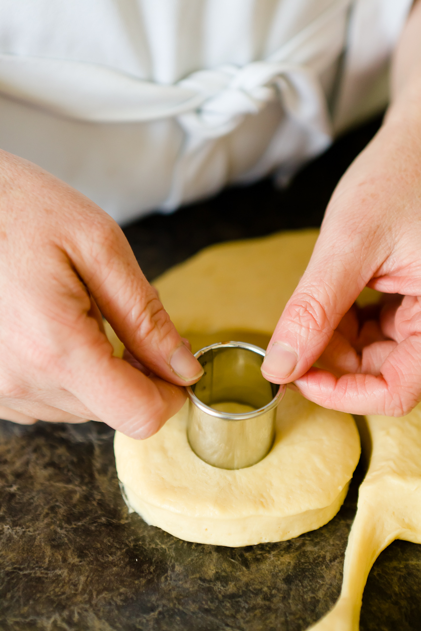 I used circle cookie cutters to cut the dough into circles and to cut the holes into the doughnuts. I have this whole set of circle cookie cutters so that I always have the size I need on hand. (View on Amazon) [paid link]