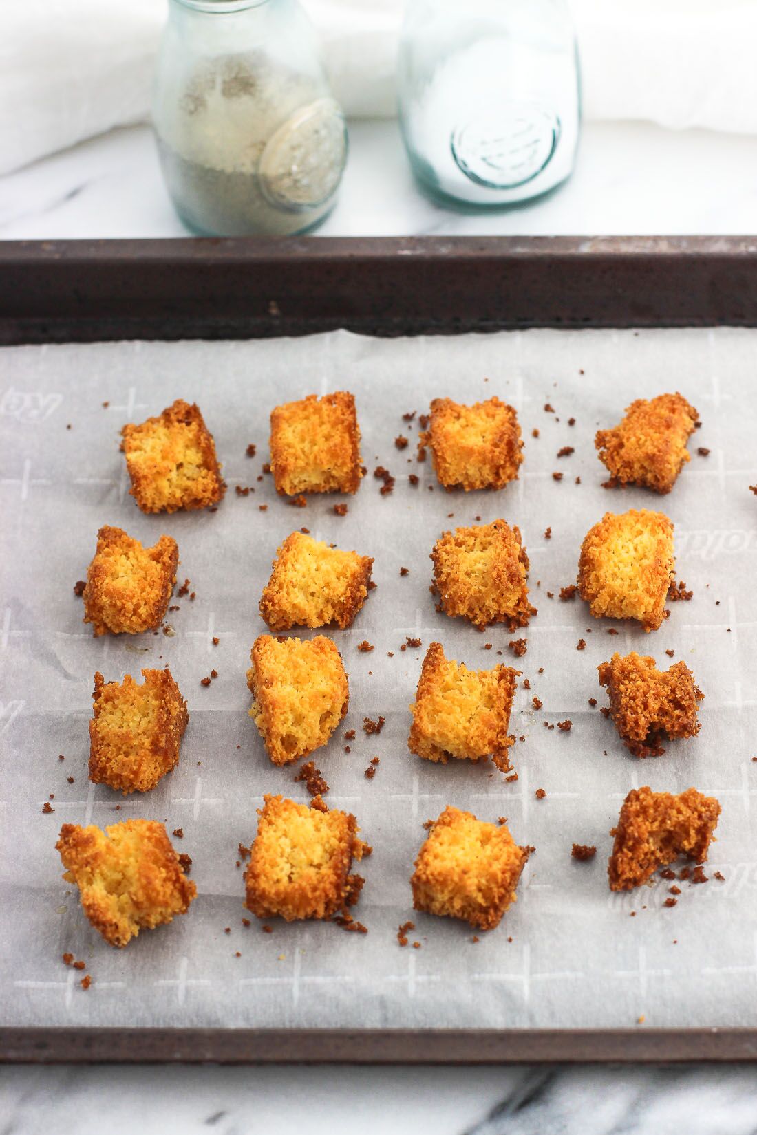 Make cornbread croutons by dehydrating cornbread in the oven or in a dehydrator. Cornbread croutons are great in a salad with pecans and cranberries.