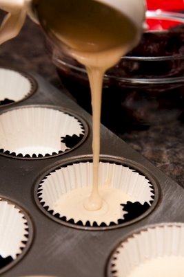 Here I am filling the cupcake liners.Note that the batter is much runnier than typical American cake batter.