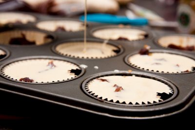 - Fill cupcake liners 1/3 full. (As noted above, I would recommend silicone liners or paper liners sprayed with a non-stick spray.)