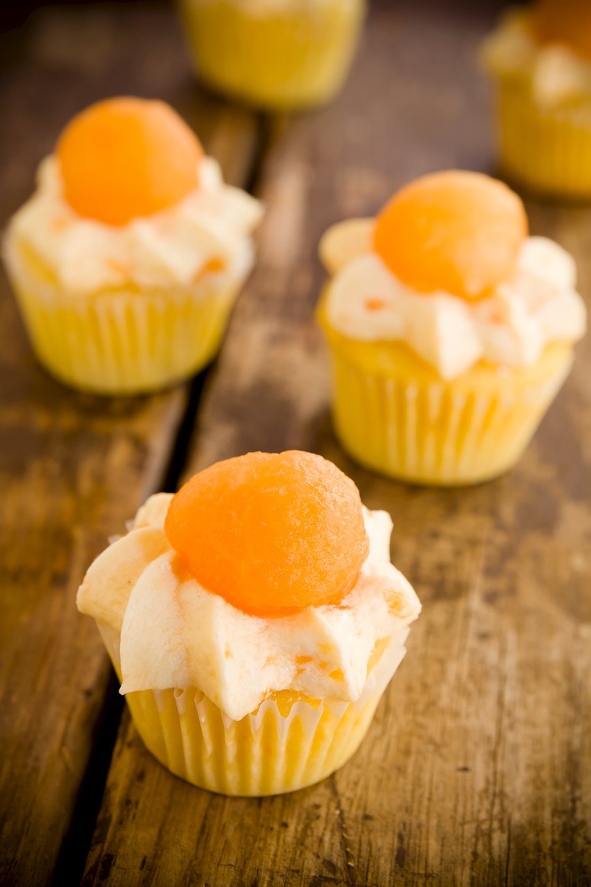 Summer must be coming to an end. My burning desire to wear worn-out jeans, boots, and anything chocolate brown is almost as strong as my craving to wear light skirts was in early Spring. Before letting summer and its ponytailed, sandaled, swimming pool splashes disappear, I had to give it a proper cupcake sendoff. The golden ball of cantaloupe that tops these cantaloupe cupcakes almost looks bright enough to give you one last tan (or, in my case, burn).