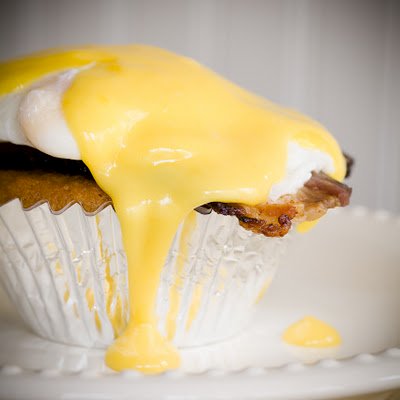Cupcakes Benedict – Maple Cupcakes Topped with Black Forest Bacon, Poached Eggs, and Maple Hollandaise Sauce