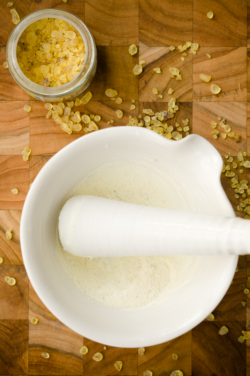 Mastic Powder: If you grind the mastic tears with a mortar and pestle, you end up with fine cream-colored mastic powder. Mastic powder can be used to flavor custards, cookies, and cupcakes. I’ll be posting soon about the Winterfresh cupcakes that I created using mastic. Not only are they unique and tasty, but after eating one, my mouth feels tingly clean.